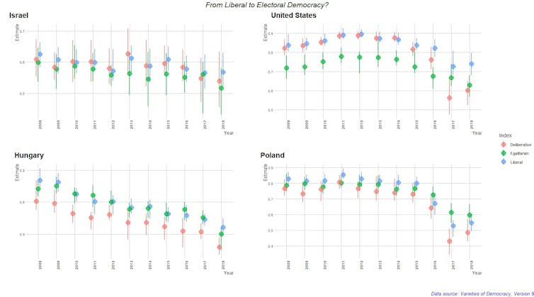 The graphs below present trends in three key aspects of democracy: the deliberative (the degree to which political decisions are based on respectful dialogue), egalitarian (whether members of all groups are able to participate and exercise their rights) and liberal dimensions. Broadly speaking, higher values indicate a more liberal democratic regime. Alongside the US and Israel, also included are Poland and Hungary: two other countries that have moved into electoral democracy territory from liberal democracy.