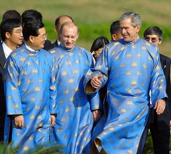 and here is George W. Bush in Chinese robes with Hu Jintao and Vladimir Putin (I can’t decide whether this is evidence that Bush is a Manchurian candidate or if it is finally the explanation for his faux macho swagger– surely this is the gayest picture of a president ever taken):