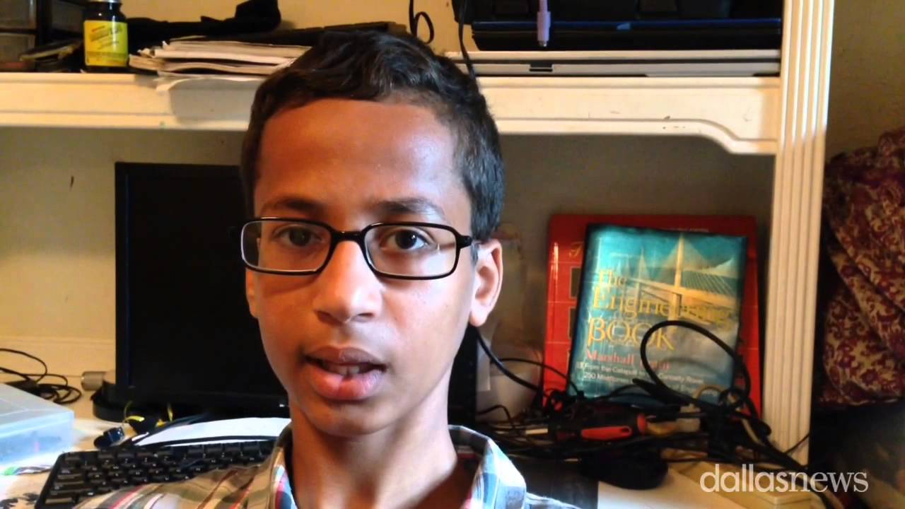“Ahmed Mohamed, 14, an Irving MacArthur High student who invents as a hobby, talks about being detained and interrogated after bringing a homemade clock to school Monday that was mistaken for a hoax bomb.”