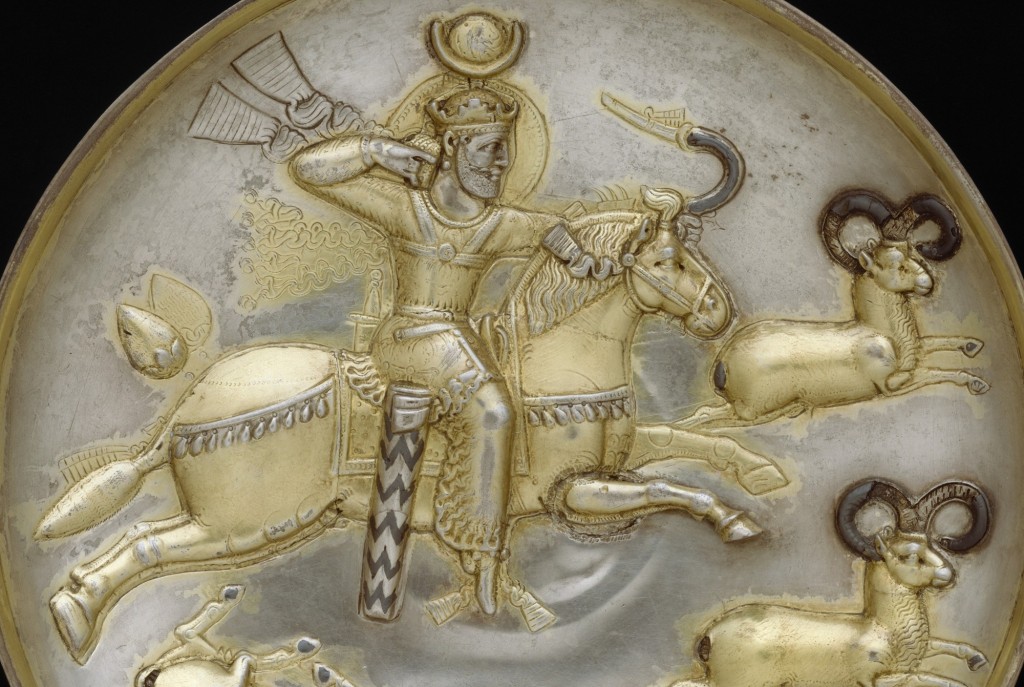 Detail, plate with royal hunting scene, depicting either Pērōz (r. 459–484 CE) or Kavād I (r. 488–497, 499-531 CE), silver, mid-5th–mid-6th c. CE (34.33; courtesy The Metropolitan Museum of Art)