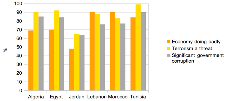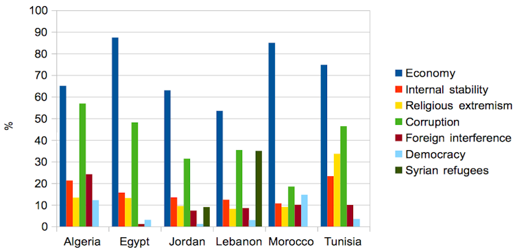 Unfortunately little has changed, as newly released opinion polls show for Morocco, Algeria, Egypt, Jordan, Lebanon and Tunisia – with upwards of 1,000 people surveyed in each country. While citizens worry about issues their governments prioritise, such as security, terrorism and religious extremism, their main concerns are the same as in 2010 – decent jobs, inflation, inequality and corruption.