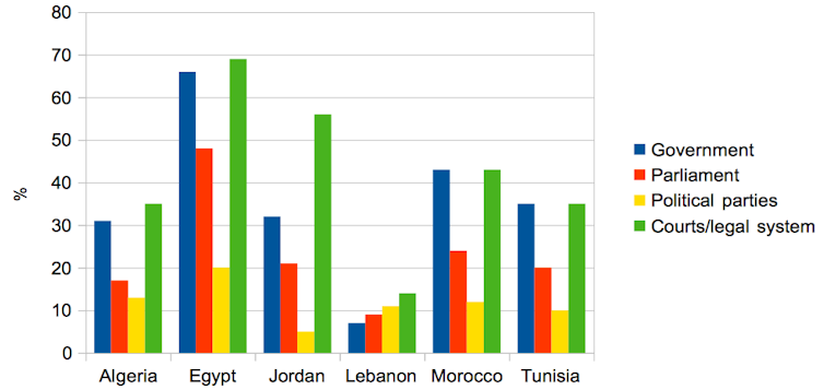 This region-wide disenchantment translates into low confidence in parliaments and political parties, the key institutions which ought to be representing citizens’ interests. Confidence varies from country to country: Lebanon again scores poorly. Egypt fares better than others, but this owes more to intense government propaganda than any real effectiveness.