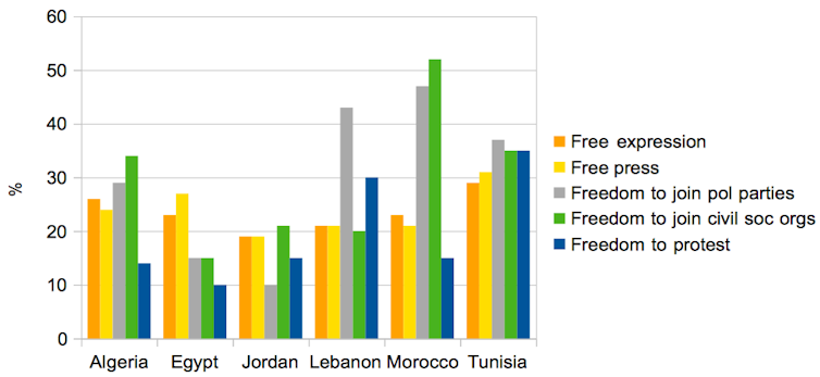 People don’t believe their governments are responsive to their priorities. Fewer than one third of Egyptians think so, while in Morocco, Tunisia, Algeria and Jordan that figure drops to a quarter or less. In Lebanon it is a mere 7%.