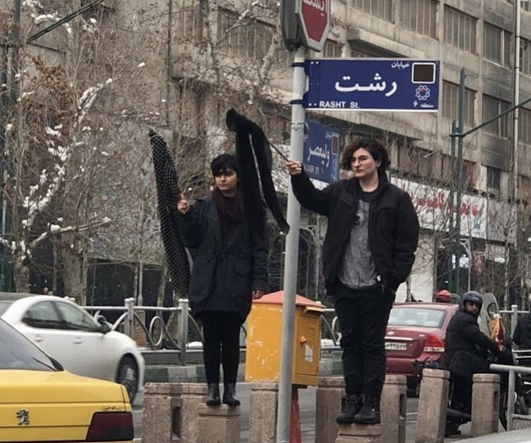The world has been surprised recently by a new wave of women’s activism in Iran. Bareheaded Iranian women climb on platforms and benches in public spaces, white scarves tied to the ends of poles, waving their hijab flags to protest compulsory veiling.