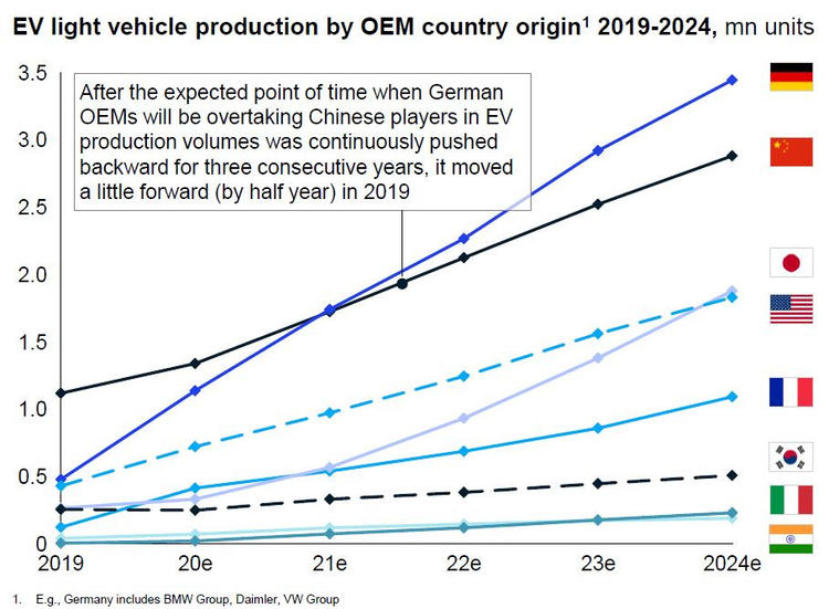 In 2021, this number is set to rise to 1.7 million vehicles, overtaking Chinese companies. German carmakers’ share of global e-car production will increase from 18 percent in the past year to 29 percent in 2024, McKinsey said.