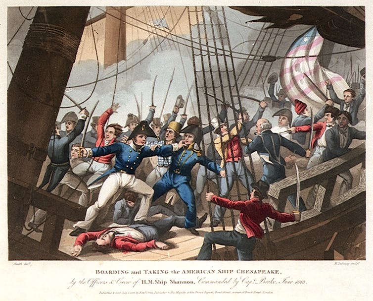 In 1805, the British also began to stop American ships along the East Coast and then, to “impress” any Irish-born sailors they found on board, compelling those sailors to serve in the Royal Navy for the great war with Napoleon. In the summer of 1807, a British warship even took sailors off a U.S. navy ship near the Virginia coast.