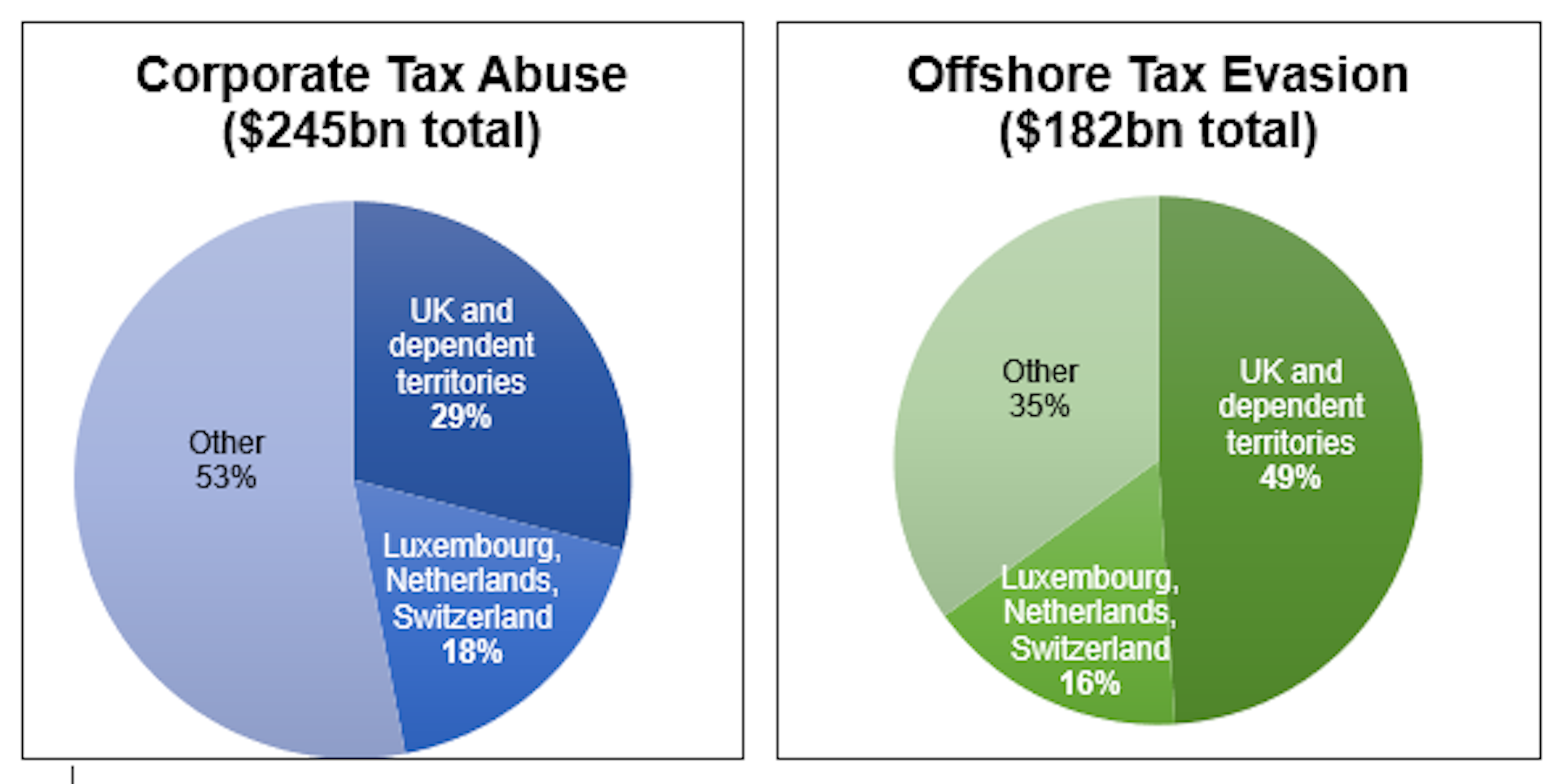 The same report also claims that the laws and practices of just four countries – the UK and its network of overseas territories and crown dependencies, along with Switzerland, the Netherlands and Luxembourg – are responsible for 55% of tax losses suffered around the world.