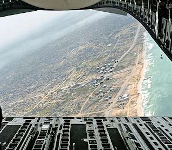 A devastated Gaza seen from the air, Air Mobility Command C-17 Globemaster III over Gaza, March 21st, 2024. US Air Force Photo. Public Domain. Via Picryl