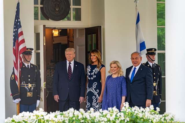 President Donald J. Trump and First Lady Melania Trump pose for a photo with Israeli Prime Minister Benjamin Netanyahu and his wife Mrs. Sara Netanyahu Tuesday, Sept. 15, 2020, at the West Wing Lobby Entrance of the White House. (Official White House Photo by Joyce N. Boghosian). Public Domain. Via Picryl.