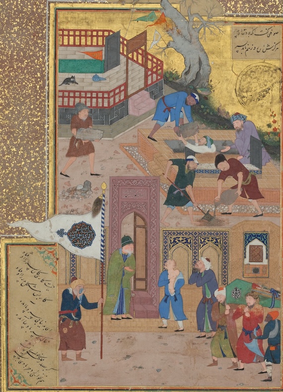“Funeral Procession”, Folio 35r from a Farid al-Din Attar’s Language of the Birds (Mantiq al-Tayr), Calligrapher Sultan ‘Ali al-Mashhadi Iranian, dated 892 AH/1486 CE, Herat. This illustration is associated with a story related by the hoopoe as a response to a bird who complains about his fear of death. In the story, a son grieves the death of his father in front of his coffin and a sufi soothes him, explaining that his father had experienced much pain and that no one can avoid death. Here, the painter depicts the incident as occurring in front of a cemetery gate. The scene behind the gate is replete with motifs that are irrelevant to the story itself. The viewer at the court may have enjoyed deciphering them. Public Domain. Via Met Museum.