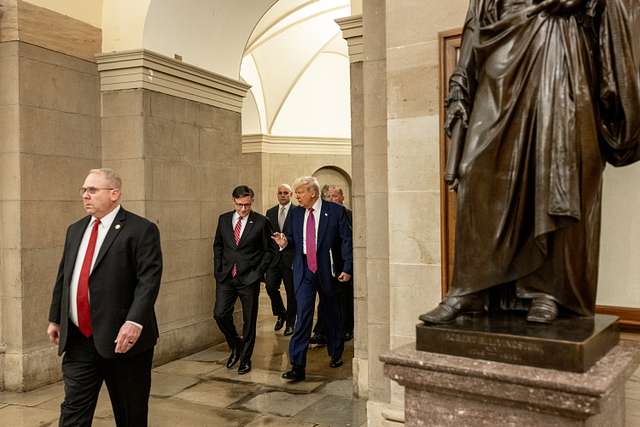 File Photo. President Donald Trump Speaker of the House Mike Johnson speak to members of the media at the U.S. Capitol in Washington, D.C., Tuesday, May 20, 2025, before meeting with the House GOP Conference about passing his budget bill. (Official White House Photo by Molly Riley). Public Domain. Via Picryl.