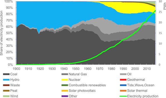 Ricardo Pinto et al. write in a paper in ScienceDirect, “Between 1900 and 1950, on average, over 95% of the world electricity was produced from coal and hydro sources, with approximately constant shares (coal representing 55% and hydro 40%).” This is how they chart electricity from coal from 1900 to 2015 (the black mass at the bottom is coal, the bright green line shows that electricity production skyrocketed over this period globally):