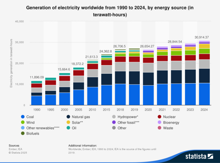 Today I want to concentrate on coal. Ember says that its share of global electricity generation fell from 34.2% to 33.1%, a reduction of 31 Terawatt hours (TWh).