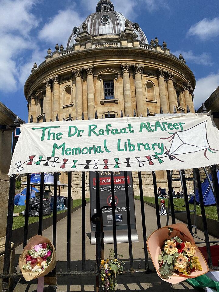 “Oxford Palestine solidarity encampment – second encampment at Radcliffe Square – 20 May 2024.” By Kiri of Karitane. Public Domain. Via Wikimedia Commons .