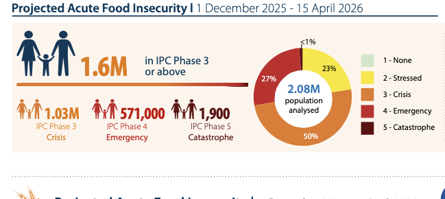 The bad news is that in October and November 2025, “the majority of the population continued to face high levels of acute food insecurity, including over 500,000 people facing Emergency (IPC Phase 4) and more than 100,000 experiencing Catastrophe (IPC Phase 5).”