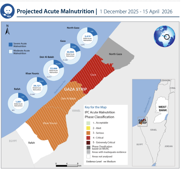In the Gaza Governorate, acute malnutrition is Phase 4, “critical” levels. In Deir al-Balah and Khan Younis governorates, malnutrition is Phase 3, “serious.”