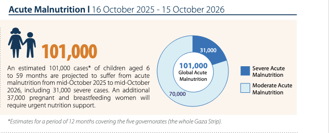 The IPC projects that under current conditions, 100,000 children in Gaza will suffer from acute malnutrition over the coming year, including 31,000 cases of severe acute malnutrition.