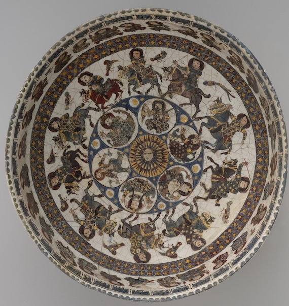 Bowl with Courtly and Astrological Motifs, late 12th–early 13th century, Central or Northern Iran. The figures and decoration on the interior of this bowl combine imagery of the courtly cycle and astronomy. In the center the sun is surrounded by personifications of the planets (clockwise) Mars, Mercury, Venus, the moon, Saturn, and Jupiter. Islamic astronomers believed the planets orbited the earth, forming seven concentric circles. An eighth, outer sphere contained the constellations and signs of the zodiac, possibly represented by the six large and twelve small gold circles between the planets’ heads. Public Domain. Metropolitan Museum, NYC.
