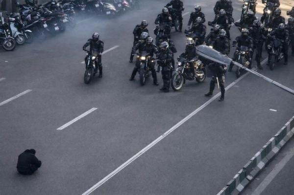An unidentified peaceful protester lone blocks the path of security forces in Tehran on January 2, 2026. The incident has been compared to The Unknown Rebel in Tiananmen Square. Public Domain. Via Wikimedia Commons.