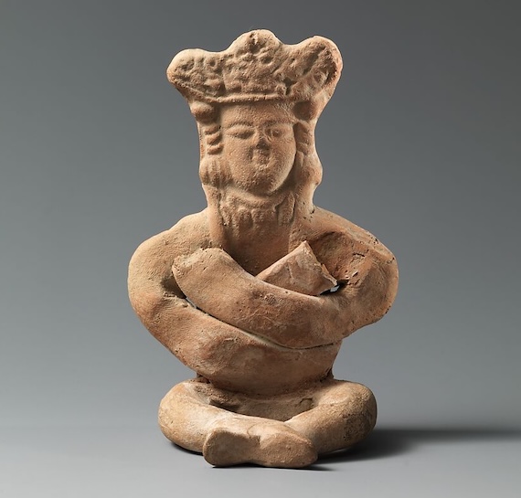 Figurine of a Seated Personage with Folded Arms and Elaborate Headdress, 12th–13th century, Iran or Iraq. NYC Met. Public Domain.