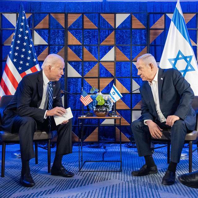 Joe Biden meets with Benjamin Netanyahu, October 18, 2023. White House Photo. Public Domain. Via Picryl .