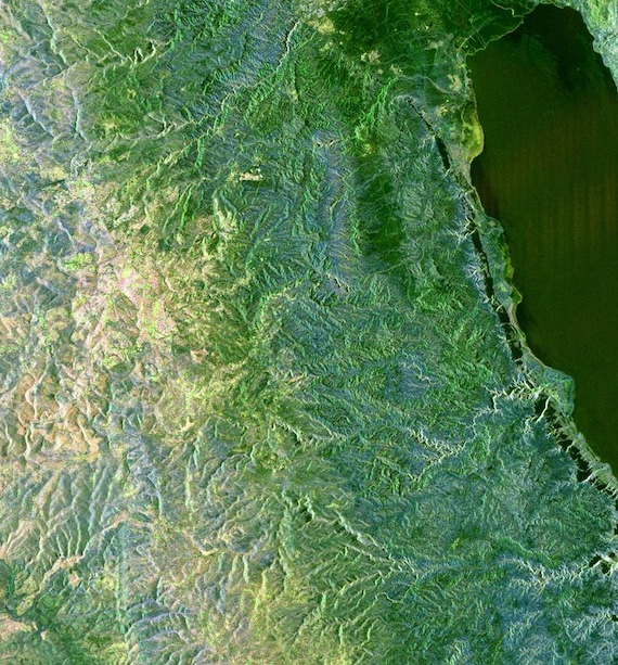 “This space radar image shows the area surrounding the Dead Sea along the West Bank between Israel and Jordan.” Via NASA / JPL. Public Domain.