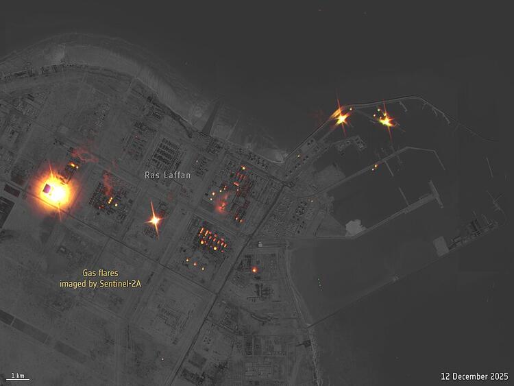 This image shows gas flares from oil production in Qatar, imaged at night on 12 December 2025. The Sentinel-2A signal is overlaid on a greyscale basemap. European Space Agency. Public Domain. Via Wikimedia Commons