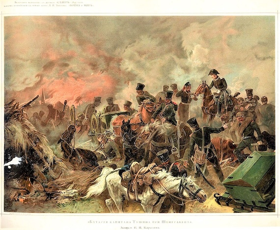 In Leo Tolstoy’s novel War and Peace is description of the artillery battery of fictional Captain Tushin at the Battle of Schöngrabern. 1893, by Nikolay Karazin (1842–1908) Via Wikimedia Commons