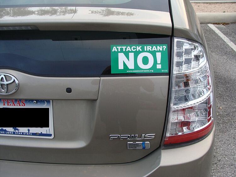 No attack Iran sticker on a vehicle in Texas. Public Domain. Via Wikimedia Commons